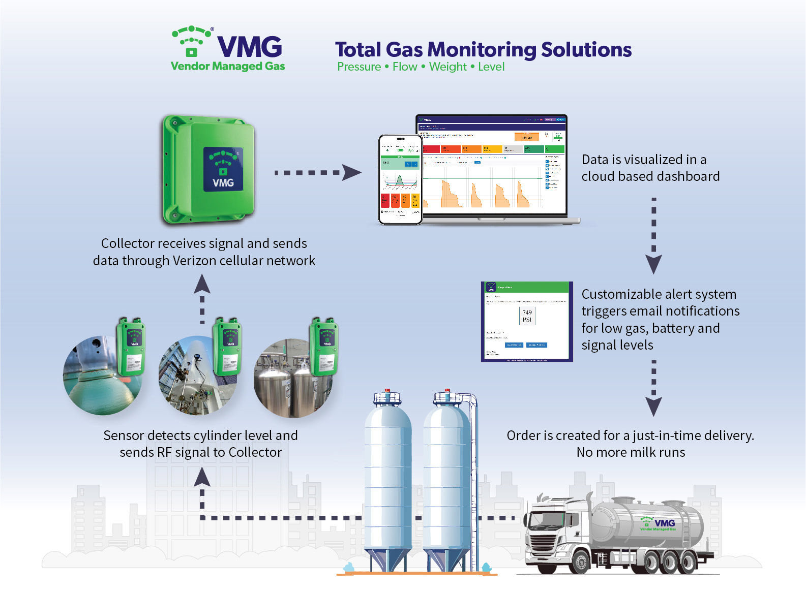 가스레벨, 가스공급 및 전반적인 가스 시스템 성능 원격 모니터링 솔루션입니다.